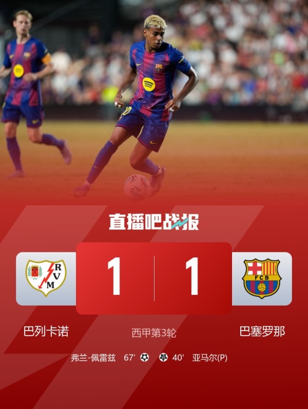 西甲-巴萨1-1巴列卡诺 亚马尔造点+点射奥尔莫失良机加西亚屡神扑